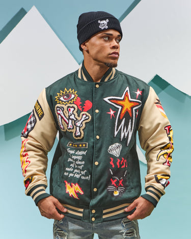 Paper Chaser Chenille Patched Varsity Jacket - Khaki