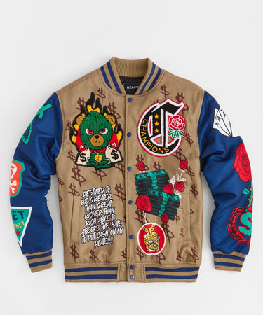 Paper Chaser Chenille Patched Varsity Jacket - Khaki